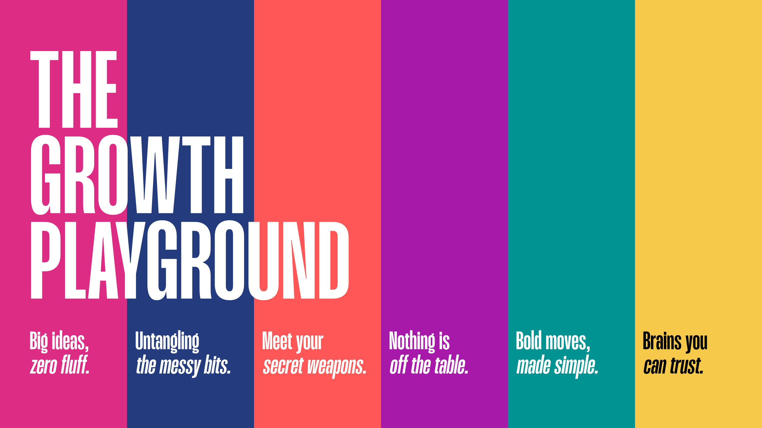 Bold moves made simple, messy bits untangled, big ideas with zero fluff, Rebecca Robinson is a business coach, consultant, design thinker, with a fresh approach and a distinctive point of difference.Highly respected, trusted by major groups and organisations, founder of ‘The Growth Playground’ with its mantra of ‘serious support, slightly mischievous’, Rebecca is ‘on a serious mission to make growing businesses more fun’.Anderson’esque colours & bold imagery.